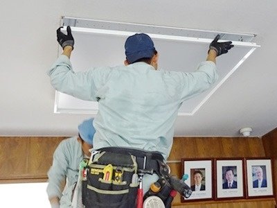 2017年09月 中村高校校長室 天井埋込型照明器具替工事 学校の校長室にある埋込型の照明器具の取替工事です。 古くなり、蛍光灯5本のうち2本が新品の蛍光灯をつけても光らなくなってしまったため、LEDの照明器具に取替を行います。 1.5M角以上の大型の照明器具の為、作業は二人掛かりで行っております。 無事取替が完了し、以前よりも明るくなりました。 ご用命いただきありがとうございました。 取替え前 取替え後